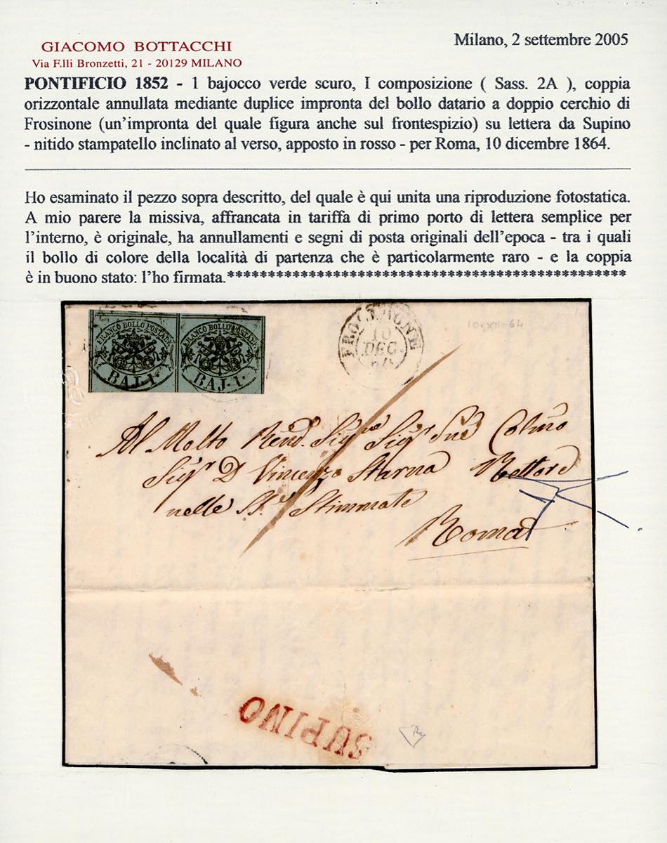 SUPINO, SI in rosso punti R2- 1 baj (2A), coppia, un esemplare sfiorato in basso, su fresca lettera del 10/12/1864 per Roma. Annullo molto raro, lettera di ottimo aspetto. Raybaudi, cert. E.Diena e Bottacchi.