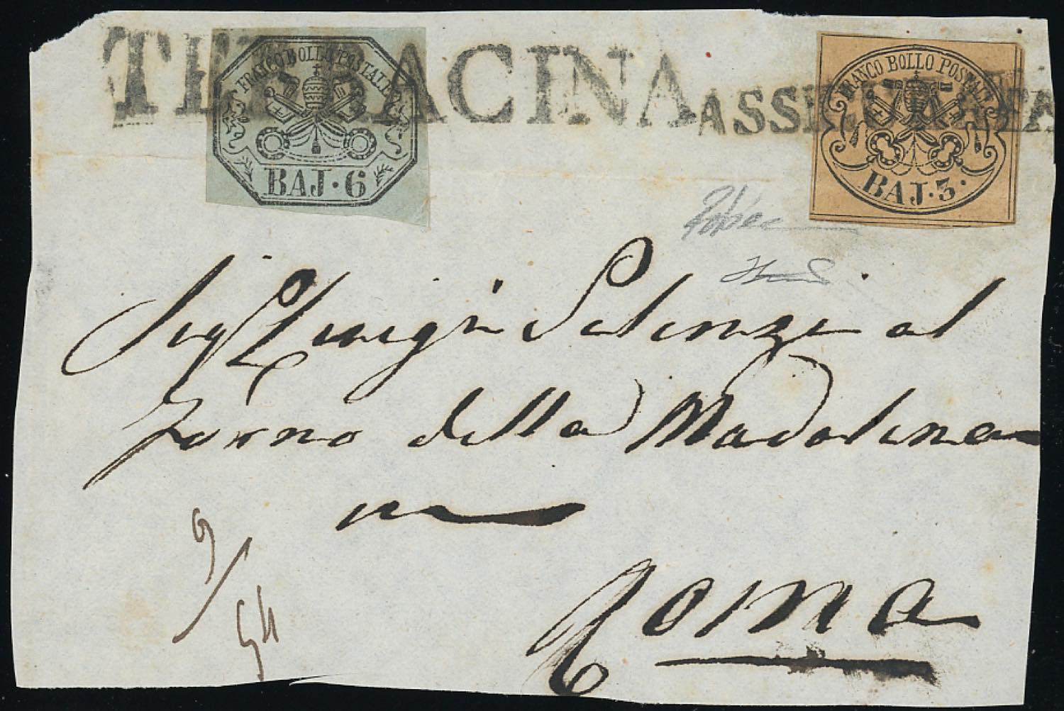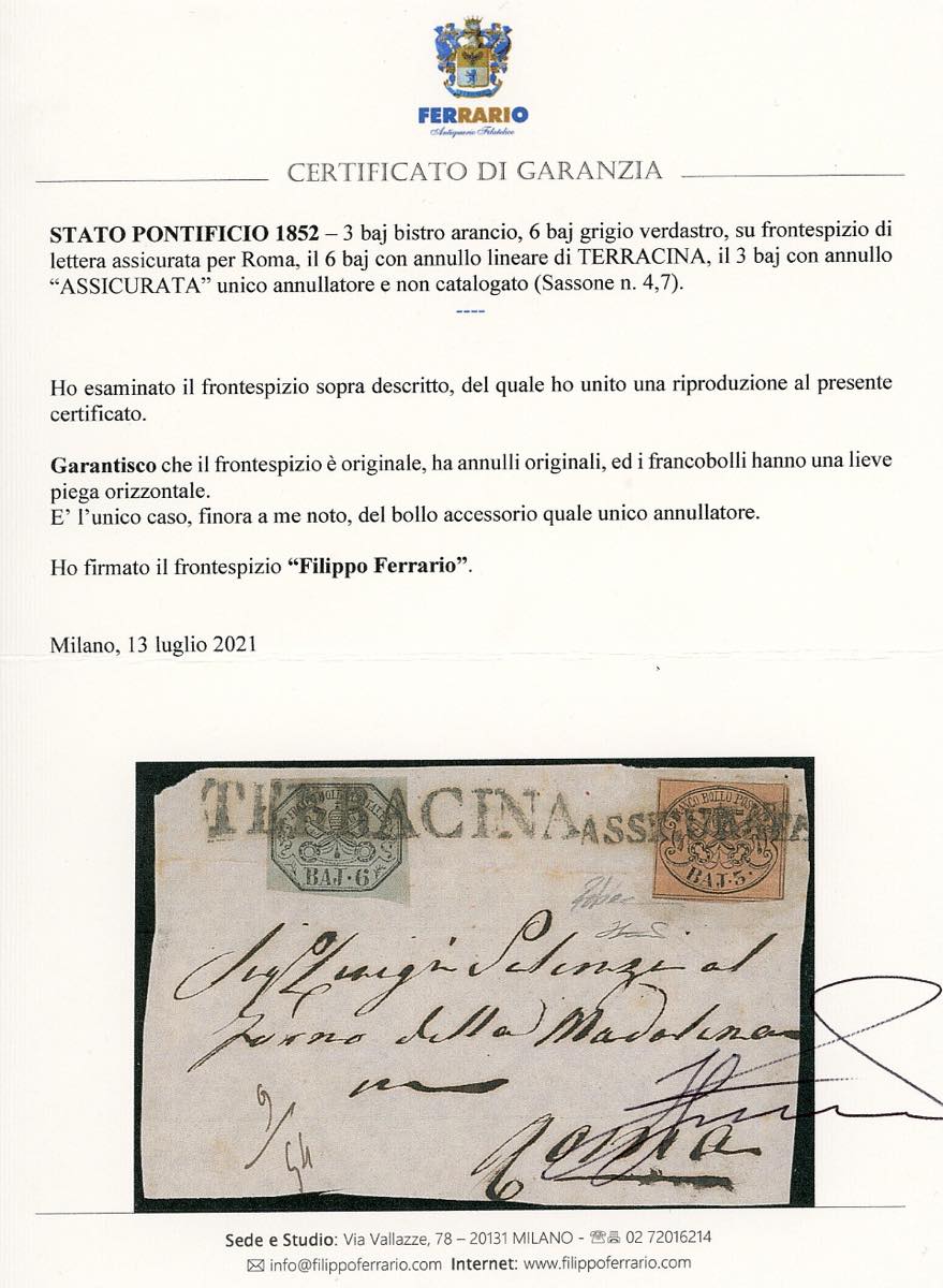 TERRACINA, assicurata annullatore non catalogato - 3 baj, 6 baj (4,7), lieve piega orizzonatle, su frontespizio di lettera assicurata per Roma. Unico caso noto del bollo accessorio unico anullatore, ad oggi inedito. R.Diena, cert. Ferrario.