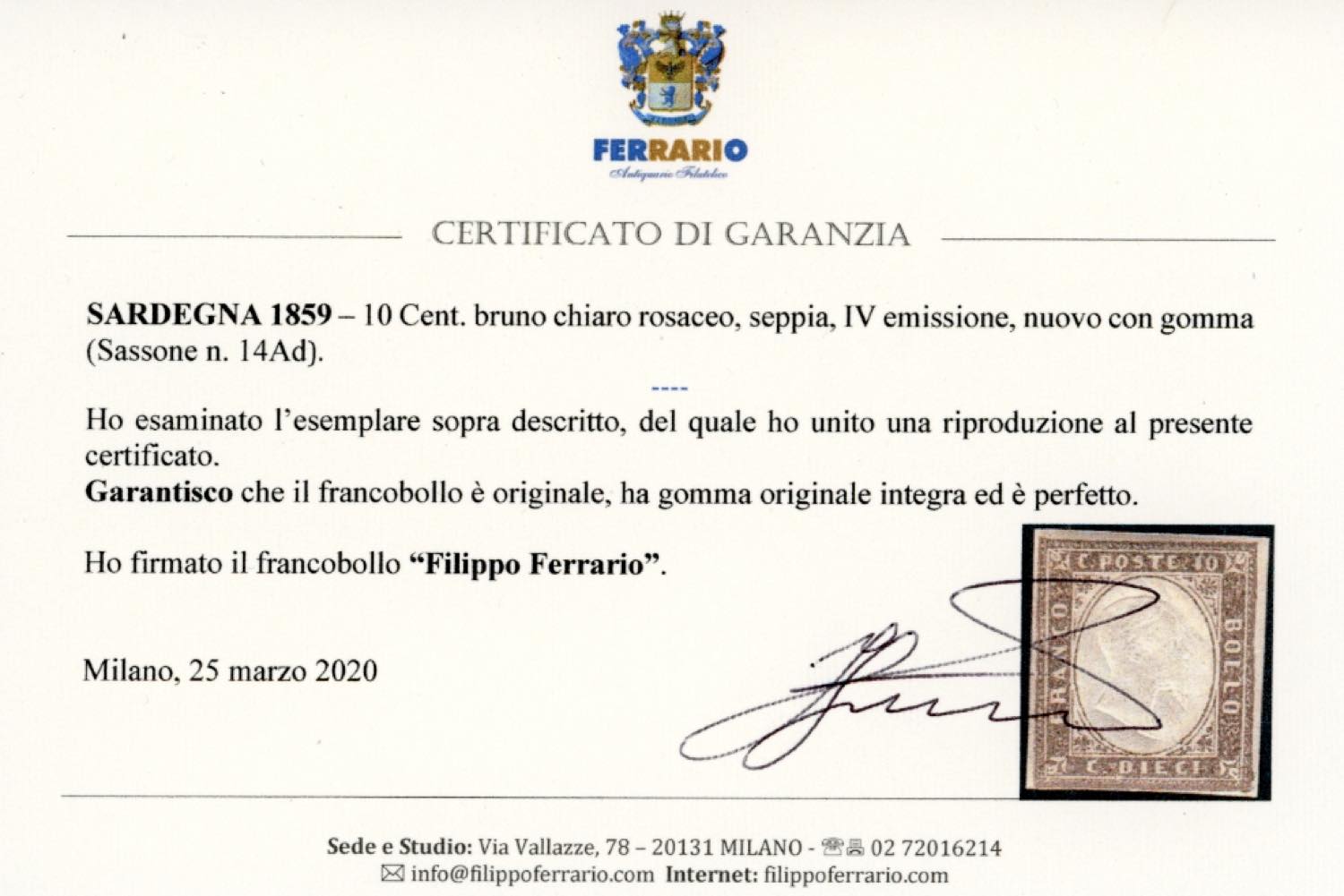 1859 - 10 cent. bruno chiaro rosaceo, seppia (14Ad), gomma originale integra, perfetto. Cert. Ferrario.