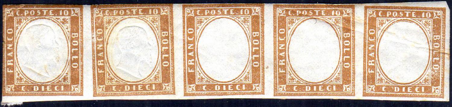 1863 - 10 cent. bistro scuro (14Eb), striscia orizzontale di cinque, i primi due esemplari con effigie, gli altri senza, gomma originale, lievi difetti. Molto rara.