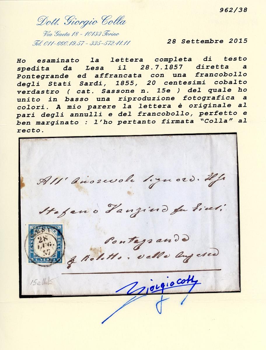1857 - 20 cent. cobalto verdastro (15e), perfetto e ben marginato, su lettera da Lesa 28/7/1857 a Pontegrande. Pregevole tinta e molto fresca. Cert. Colla.