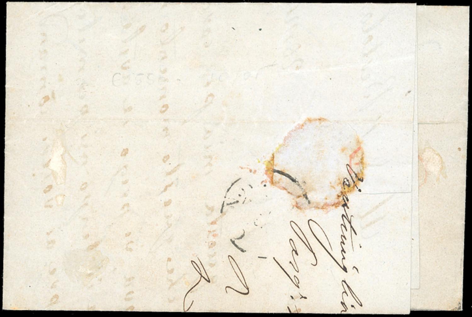 1857 - 20 cent. celeste oltremare scurissimo (15i), perfetto, su sovracoperta di lettera da Ventimiglia 16/9/1857 a Genova. Tinta estremamente rara. Cert. Sorani.