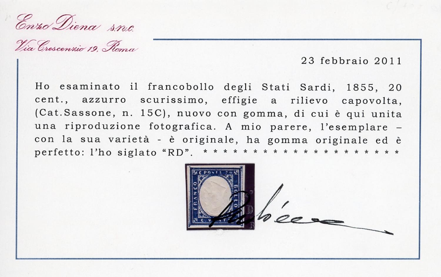 1860 - 20 cent. azzurro scurissimo, effigie capovolta (15C), nuovo, gomma originale, perfetto. Tinta non catalogata con questa varietà, la tinta più comune è quotata dal Sassone € 13.000. Cert. Diena.