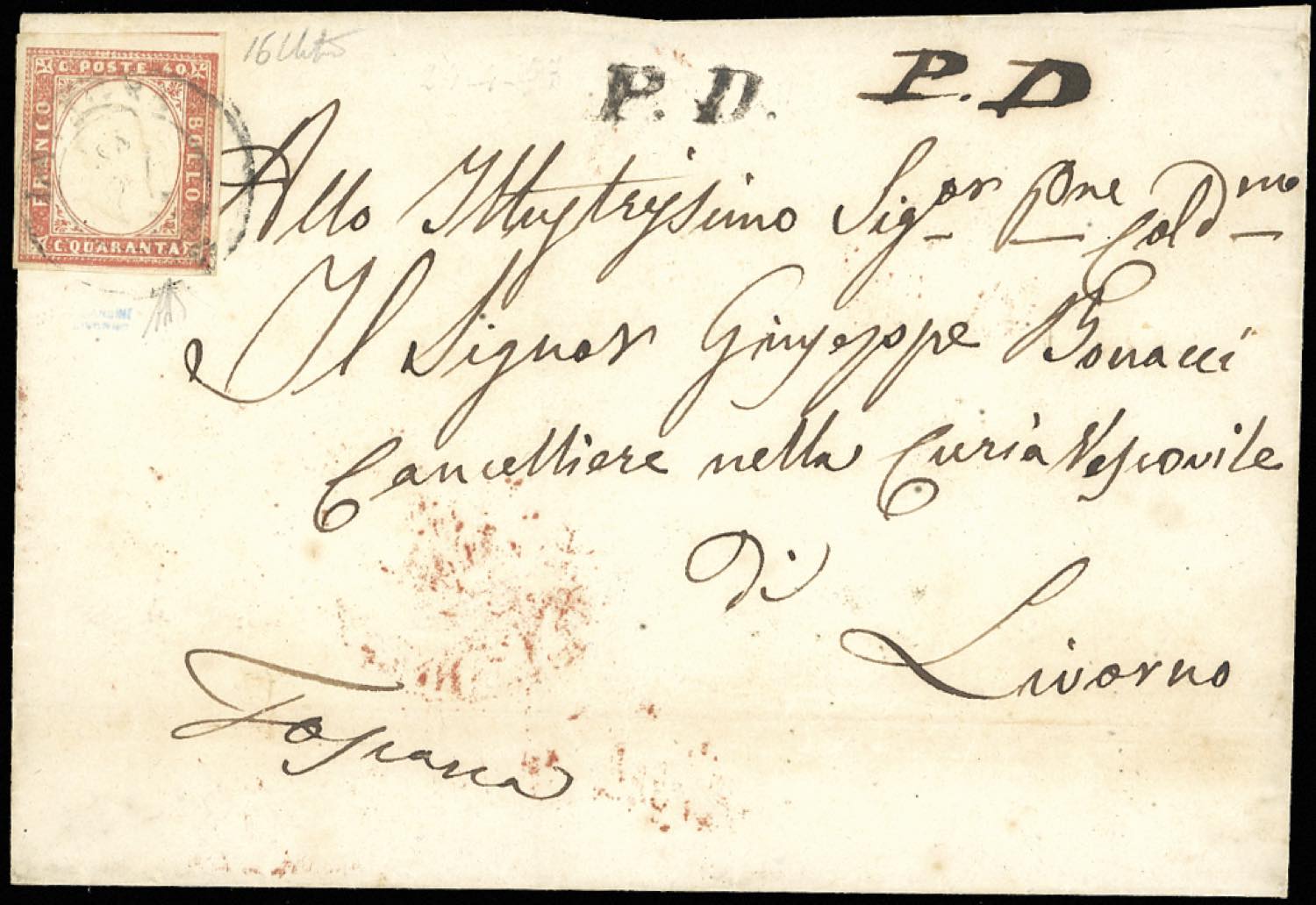 1857 - 40 cent. vermiglio tenue (16), ben marginato, lieve piega in un angolo, su sovracoperta di lettera via di terra in PD da Lavagna 24/4/1857 a Livorno. A.Diena. Ex coll. Hess.