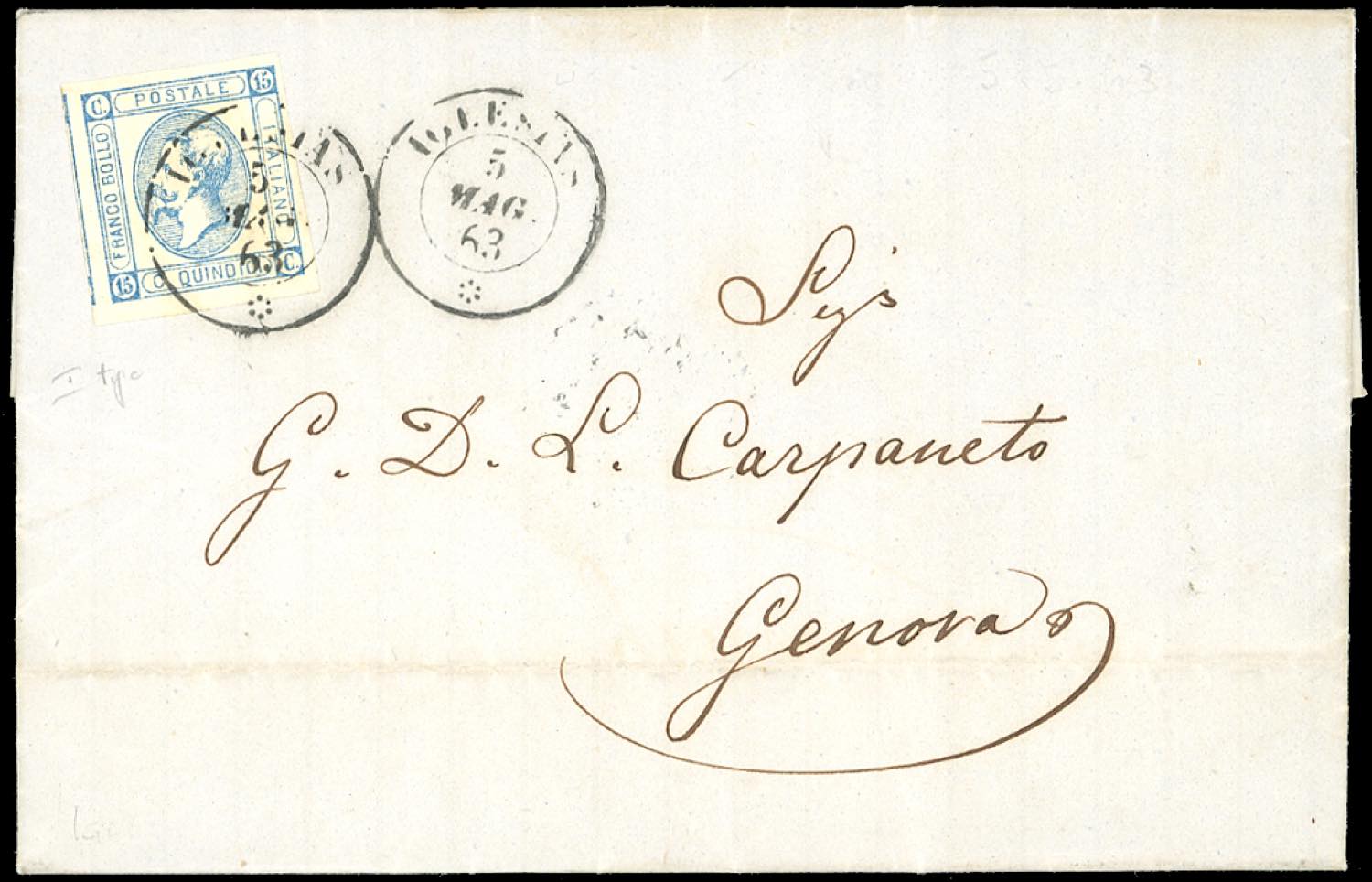 ISOLA DI SARDEGNA-IGLESIAS, punti 7 - 15 cent. (12), perfetto, su lettera del 5/5/1863 per Genova. Bella.