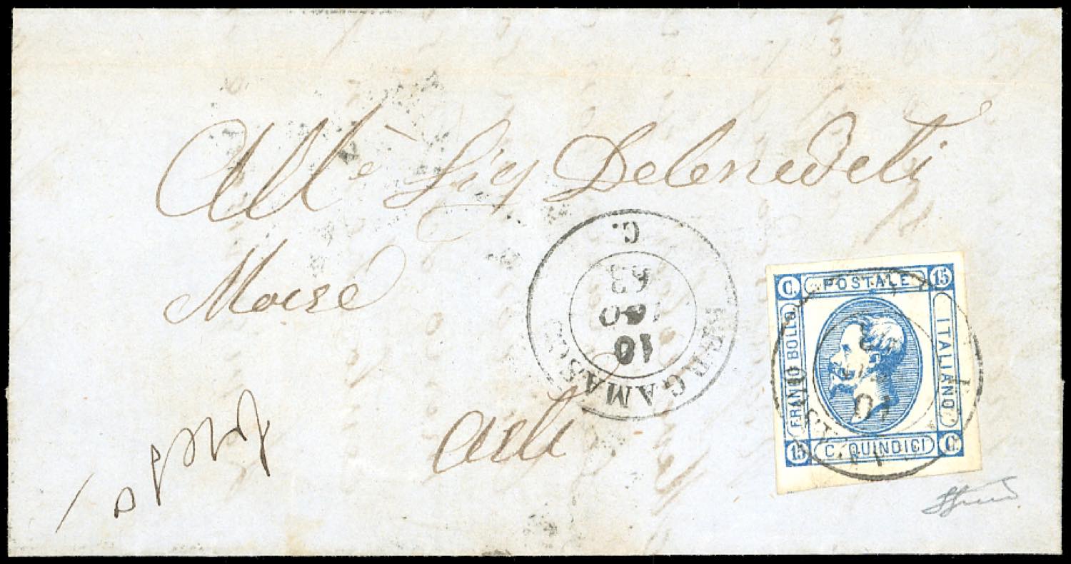 PIEMONTE-BERGAMASCO, punti 11 - 15 cent. (13), perfetto, su lettera del 10/8/1863 per Asti. Ferrario.