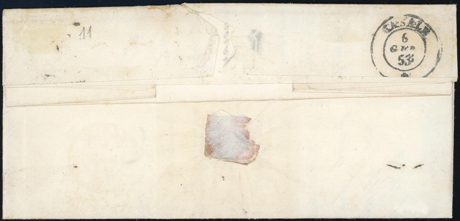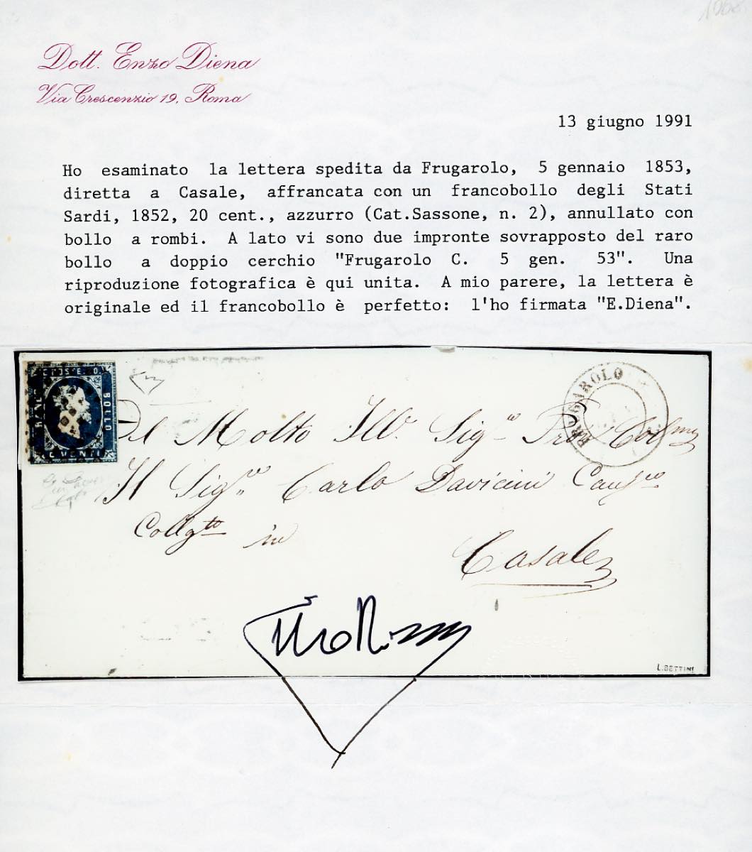PIEMONTE-FRUGAROLO, punti 13 - 20 cent. (2), perfetto, su lettera del 5/1/1853 per Casale. Rara. Gaggero, cert. E.Diena.