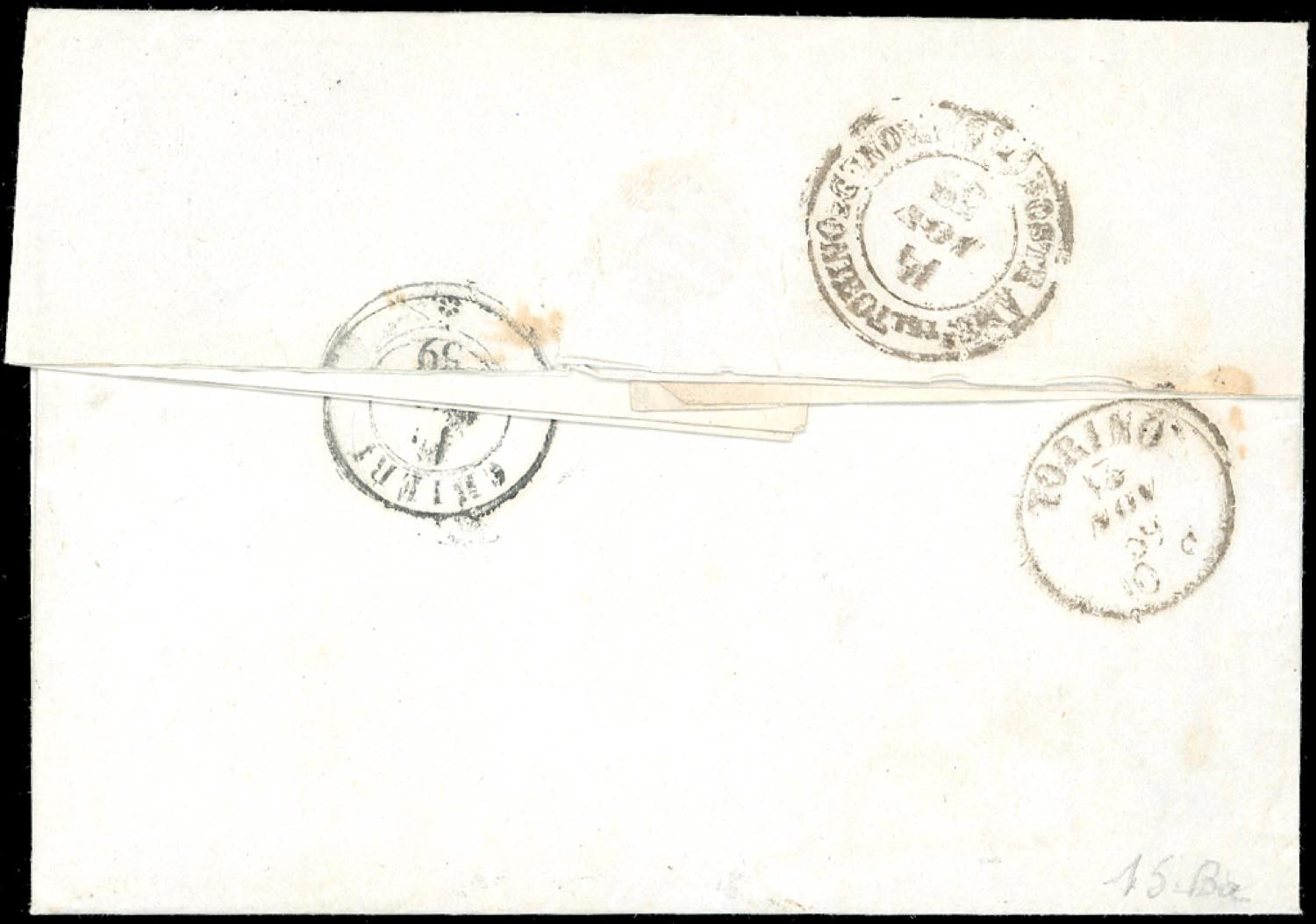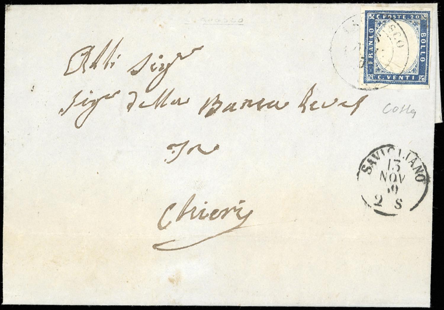 PIEMONTE-LAGNASCO, punti 13 - 20 cent. (15Ba), perfetto, su fresca lettera del 12/11/1859 per Chieri. Raro annullo, quasi sempre poco leggibile. Cert. Colla.
