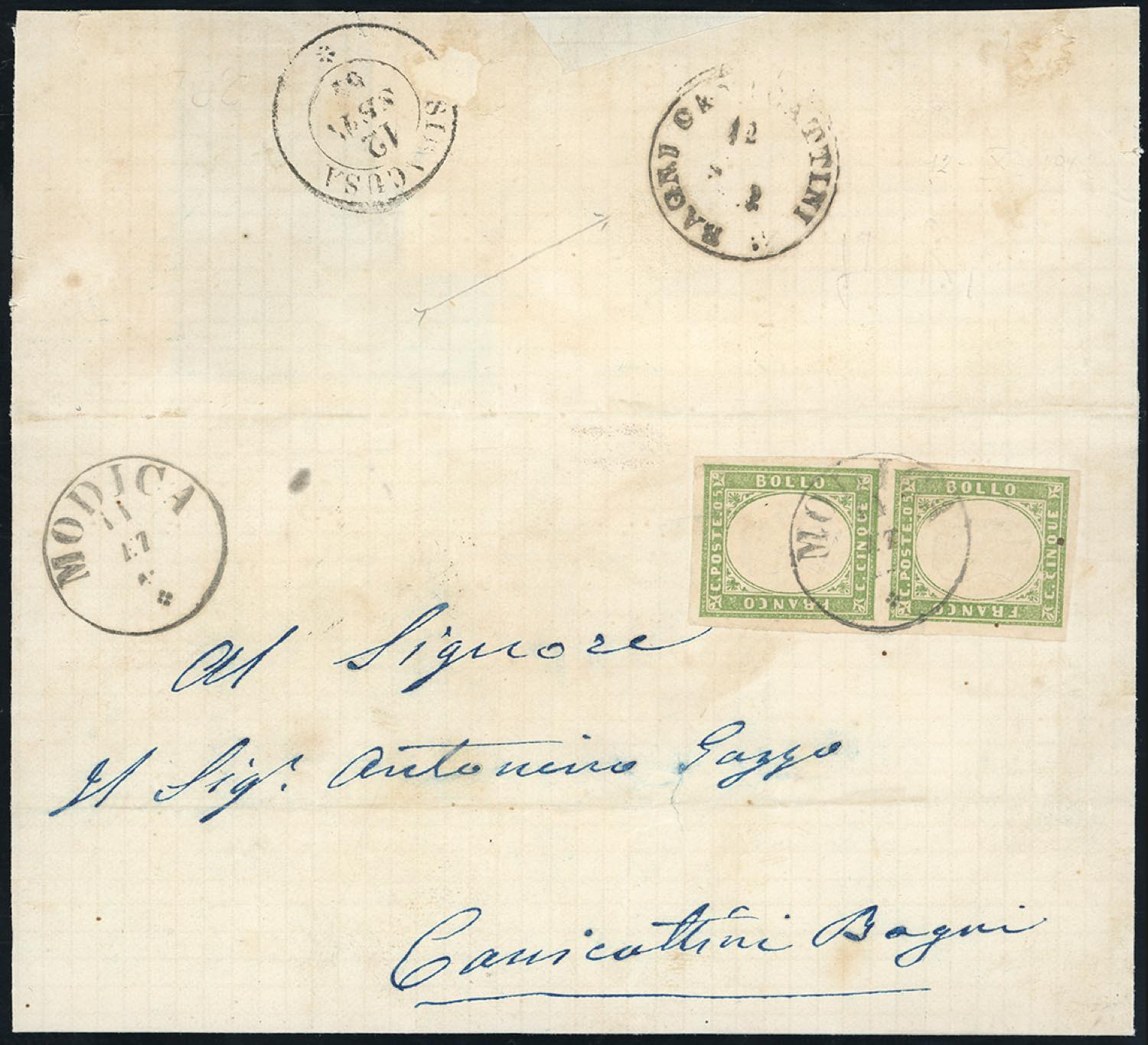 BAGNI CANICATTI', sardo italiano - 5 cent. verde oliva chiaro IV emissione di sardegna (13Ca), coppia verticale, perfetta e ben marginata, su lettera da Modica 12/9/1862 a Canicattì Bagni. Annullo di arrivo molto raro, non catalogato in questo periodo.