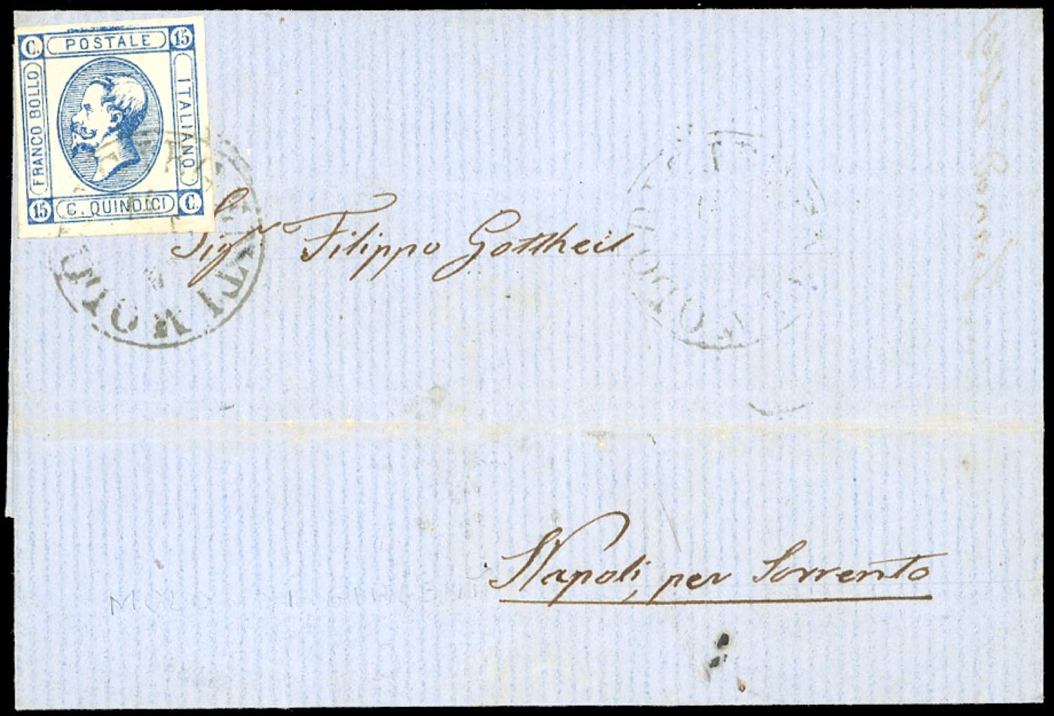 MOLO DI GIRGENTI, sardo italiano punti 10 - 15 cent. (Regno 13), perfetto, su lettera del 14/10/1863 per Sorrento. Non comune.