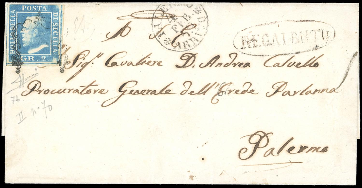 REGALBUTO, ovale rosso nerastro punti R1 - 2 grana, II tavola, posizione 70 (7b), perfetto, su fresca sovracoperta di lettera per Palermo 4/2/1860. Raro annullo. Em.Diena, cert. Sorani.