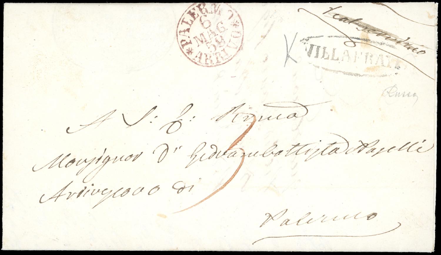 VILLAFRATI, ovale punti R1 - Lettera "schiava" per Palermo 6/5/1859, tassata 3 grana. Impronta molto rara, eccezionalmente nitida e ben impressa, Russo, cert. Bottacchi.