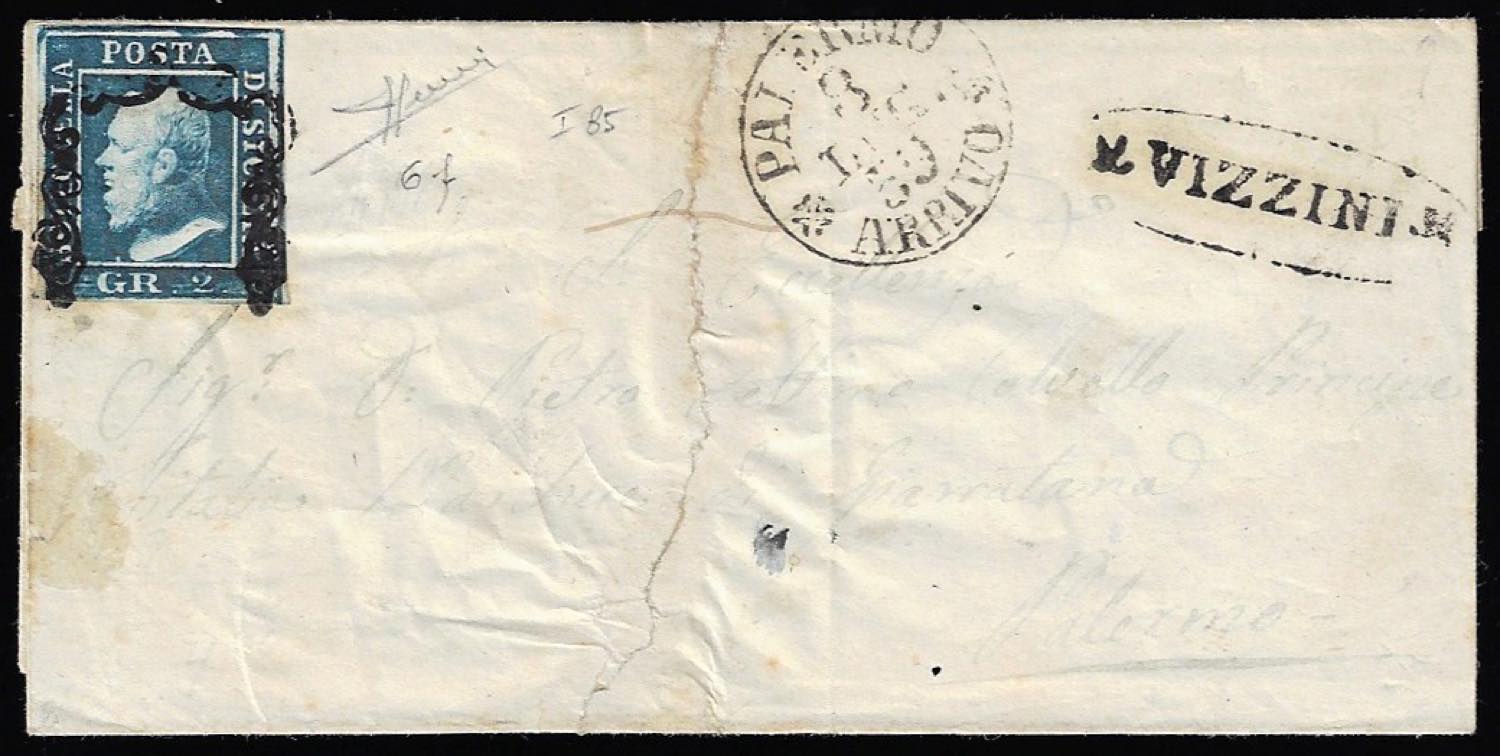 VIZZINI, ovale punti 13 - 2 grana (6f), perfetto, su sovracoperta di lettera per Palermo 8/7/1859. Cert. Sorani.