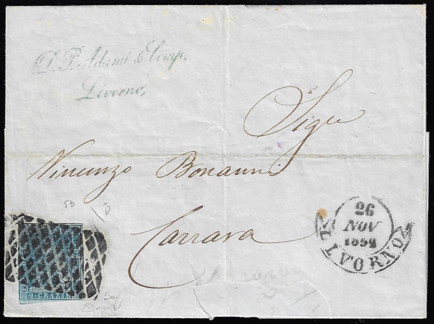 1852 - 2 crazie azzurro verdastro su azzurro (5c), perfetto, su sovracoperta di lettera da Livorno 26/11/1852 a Carrara. E.Diena, cert. Raybaudi.