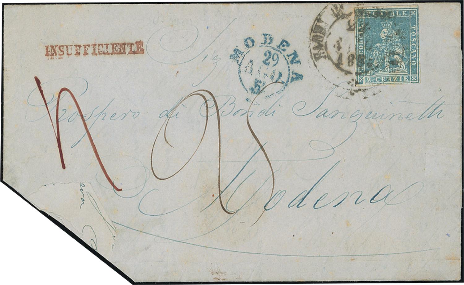 1854 - 2 crazie azzurro su grigio (5d), giusto a destra, su lettera, angolo inferiore sinistro mancante, insufficientemente affrancata da Bagni S. Giuliano 27/8/1854 a Modena, lineare rosso "insufficiente" e tassa 4 crazie convertita in 25 cent., tagli di disinfezione. Interessante e non comune!
