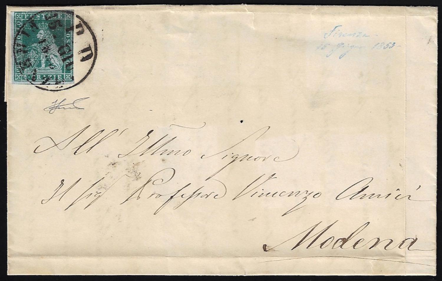 1853 - 4 crazie verde azzurro su azzurro (6a), perfetto, su sovracoperta di lettera da Firenze 15/06/1853 a Modena. Molto fresca. Ferrario.
