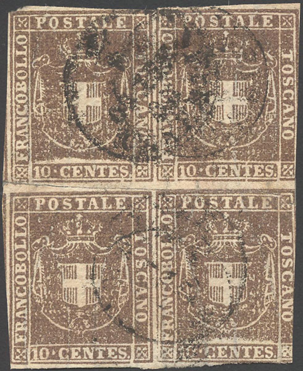 Lotto 780 - 1860 - 10 cent. bruno (19), blocco di quattro ricomposto ...