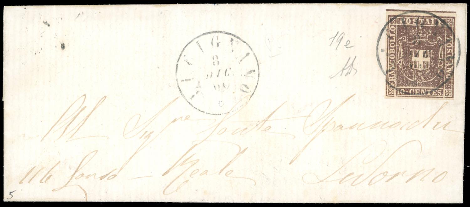 1860 - 10 cent. bruno, linea di riquadro orizzontale in alto (19f), perfetto, su lettera da Lucignano 8/12/1860 a Livorno. A.Diena.
