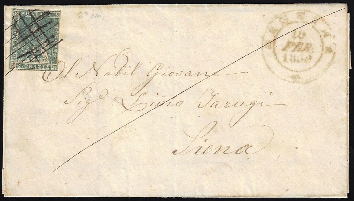 CASCINA, a penna punti 9 - 2 crazie (13b), corto a destra, su sovracoperta di lettera del 10/2/1859 a Siena.