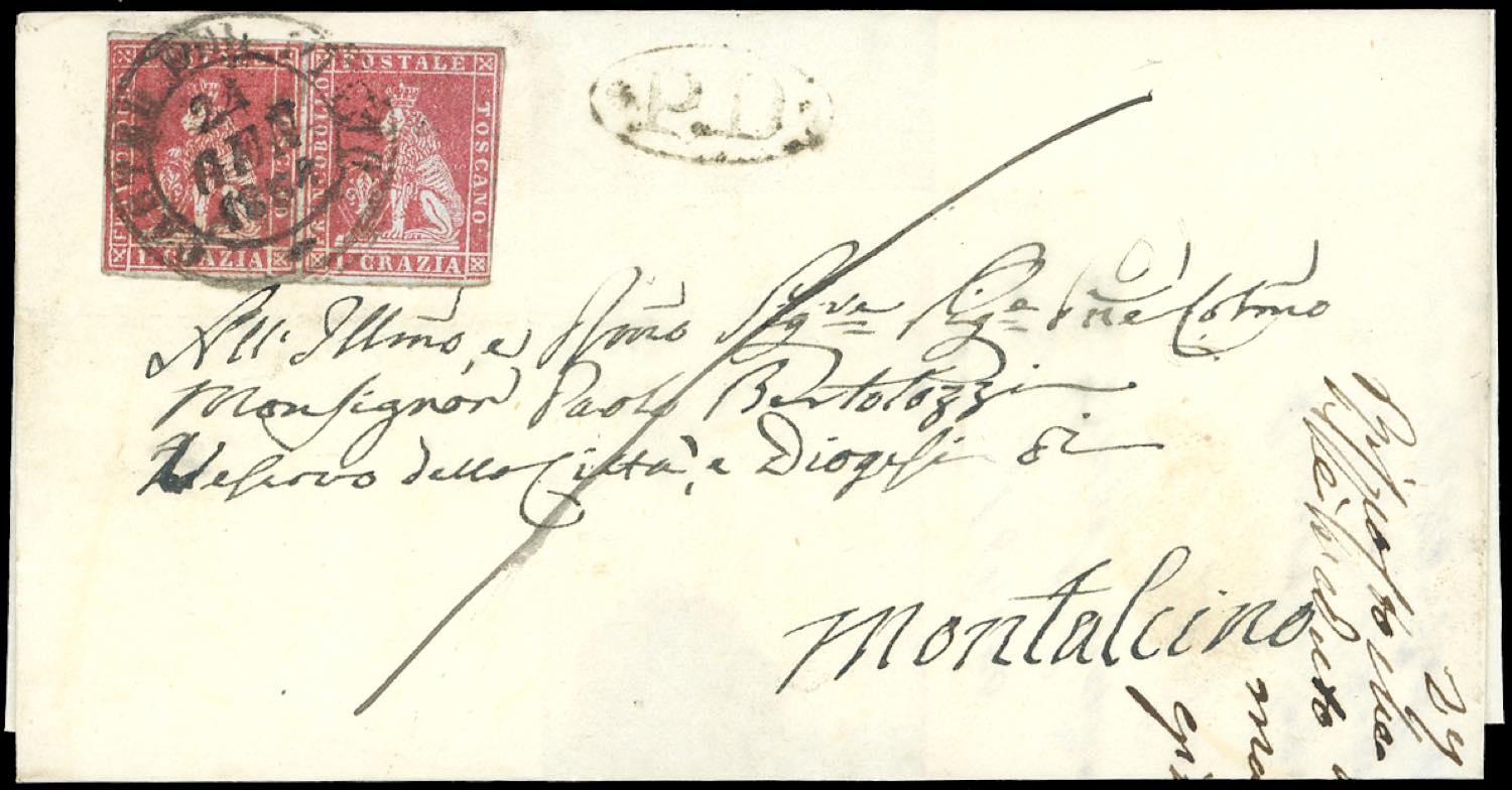 CASTEL DEL PIANO, PD ovale - 1 crazia (4), coppia, leggermente intaccata a destra, su fresca sovracoperta di lettera del 24/1/1854 per Montalcino. Ottimo aspetto.