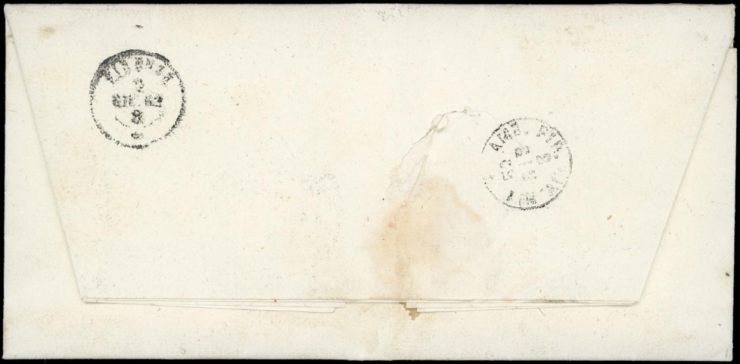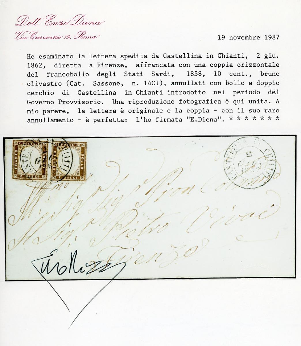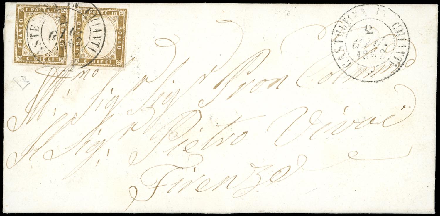 CASTELLINA IN CHIANTI, doppio cerchio punti R1 - 10 cent. IV emissione di Sardegna (14Cl), coppia, margine sinistro completo, su fresca lettera del 2/6/1862 a Firenze. Rara e molto fresca. Cert. E.Diena.