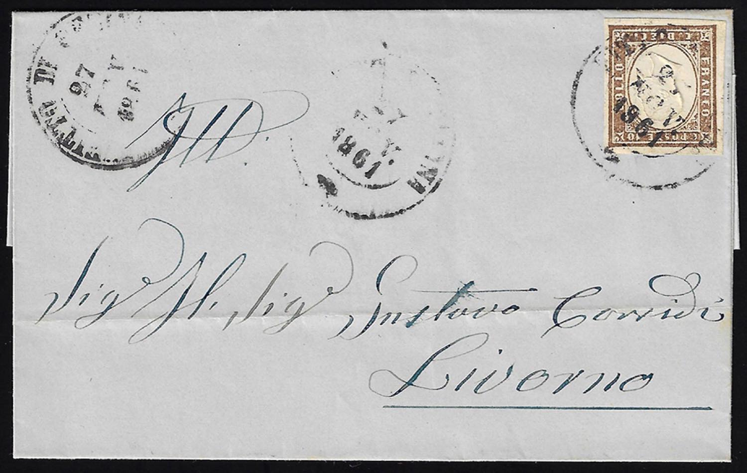 FITTO DI CECINA - 10 cent. (Sardegna 14, tinta del 1861), perfetto, su sovracoperta di lettera del 27/11/1861, datario ripetuto tre volte, per Livorno. Insolita bollatura multipla.