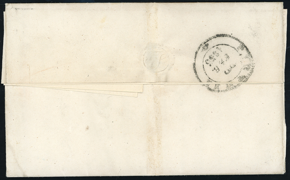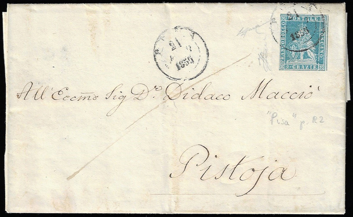 PISA, doppio cerchio piccolo punti R2 - 2 crazie (5), leggermente sfiorato a sinistra, su lettera del 21/2/1855 per Pistoia. Rara! Ferrario.
