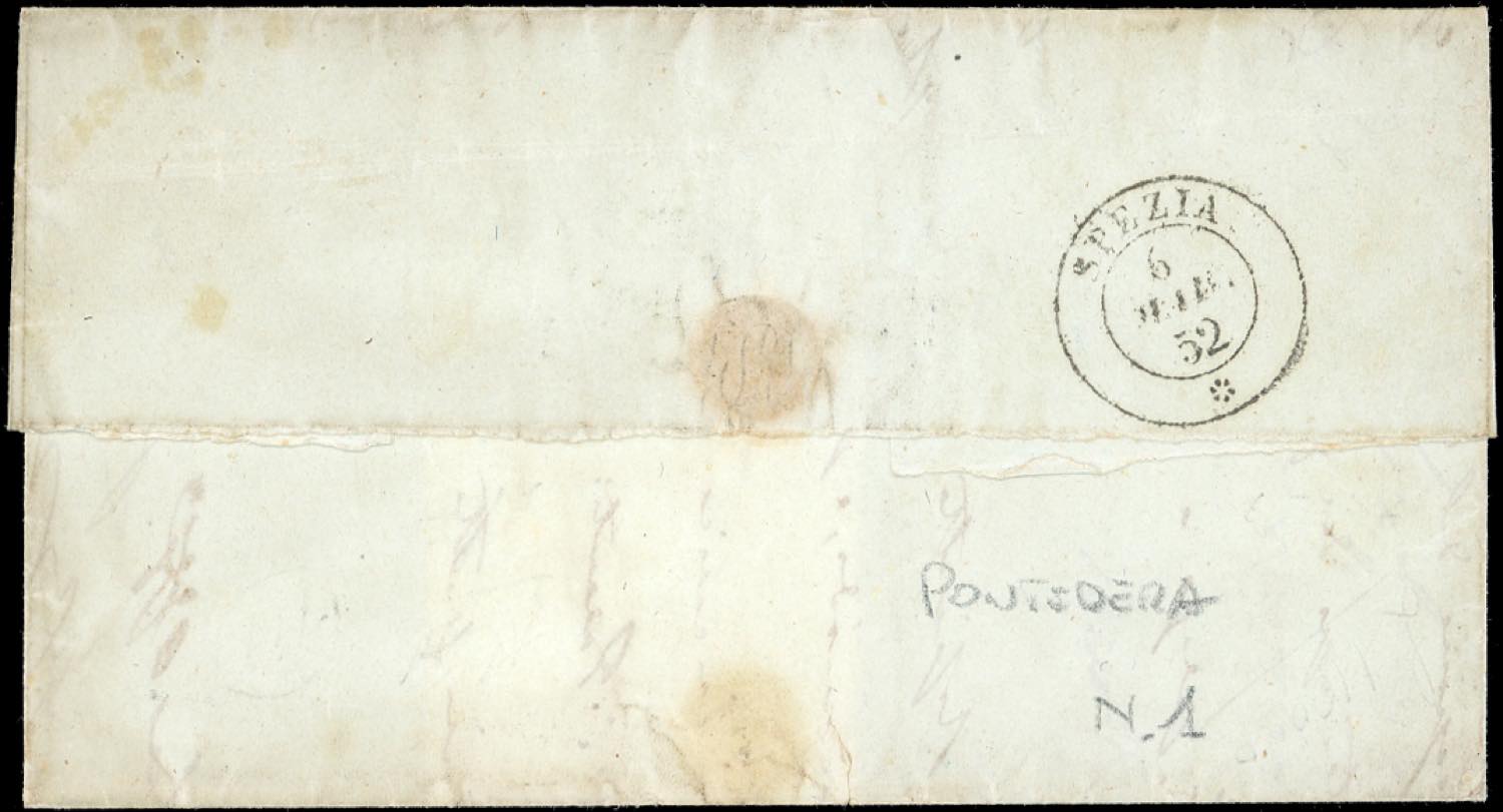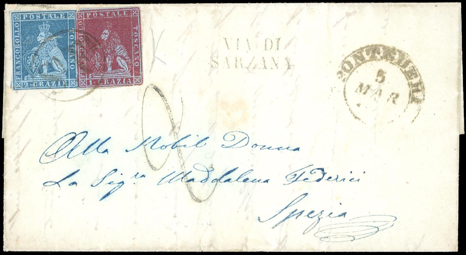 PISA, S.a F.a - 1 crazia, 2 crazie (4a,5b), difetti, su lettera da Pontedera 5/3/1852 a La Spezia, tassata 20 cent. per il porto interno sardo. I francobolli vennero annullati con il solo bollo ferroviario. Estremamente rara e di ottimo aspetto. Cert. Bottacchi.