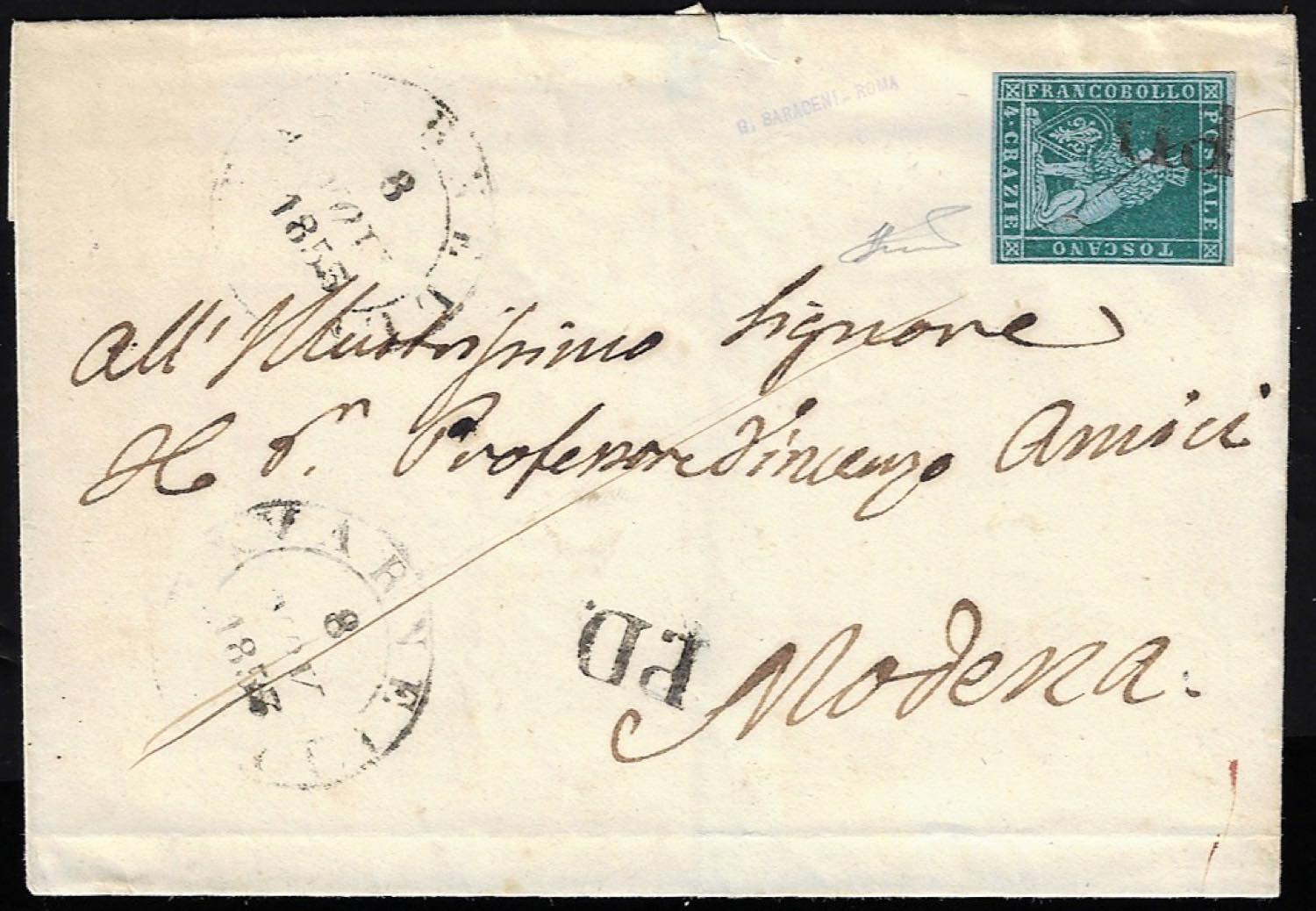 TAVARNELLE, PD punti 11 - 4 crazie (6b), perfetto, su sovracoperta di lettera del 8/11/1853 per Modena. Molto bella. Cert. Ferrario.