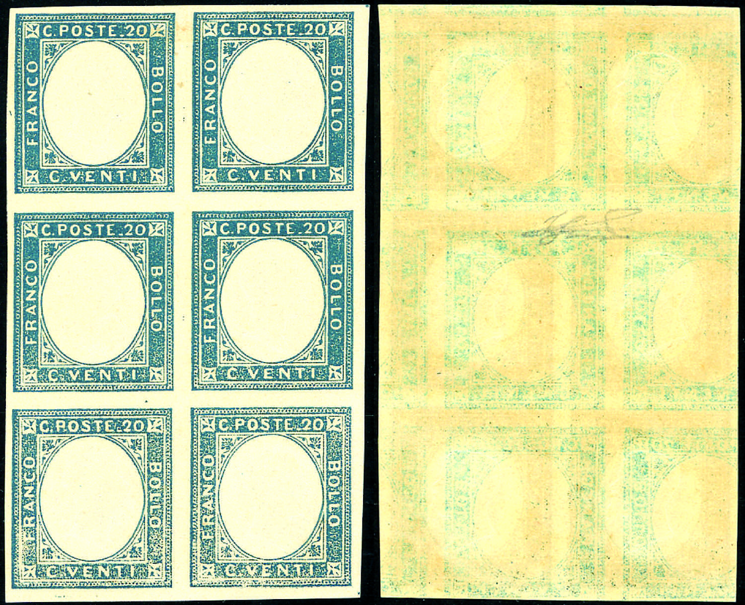 1861 - 20 cent. indaco, non emesso (3b), decalco spostato al verso, blocco di sei esemplari, gomma integra, perfetto. Rara varietà non catalogata, di splendida qualità. Ferrario. Ex collez. Imperato.