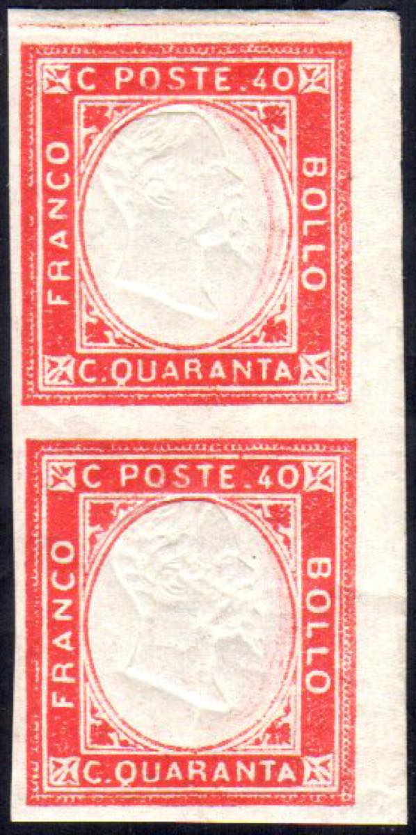 1861 - 40 cent. vermiglio, non emesso (4), coppia verticale con il margine di foglio a destra non tosato, gomma integra, perfetta. Rara! Ferrario.