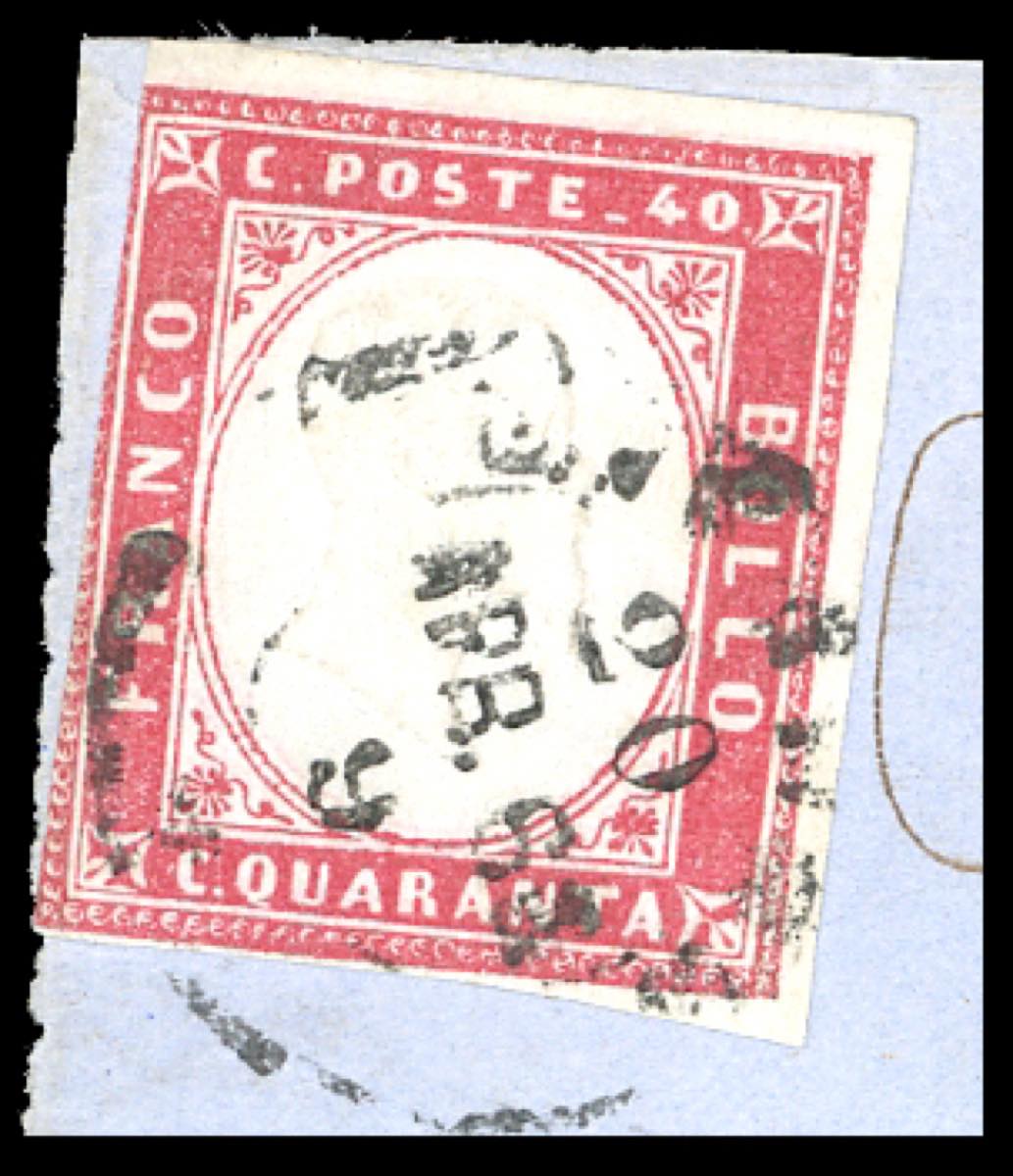 1863 - 40 cent. rosa (3d), eccezionale in affrancatura mista con 40 cent. rosa carminio della IV emissione di Sardegna, due esemplari (16E), su fresco frontespizio di lettera di triplo porto da Livorno 20/4/1863 a Parigi, in Francia. Rarissima affrancatura multipla mista Sardegna-Italia di valori gemelli da 40 cent., dentellato e non.