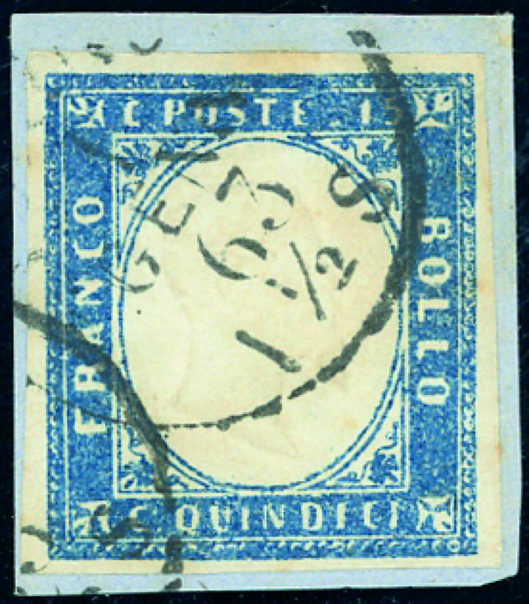 1863 - 15 cent. azzurro, tipo Sardegna (11), perfetto, usato su frammento 1/1/1863, primo giorno d'emissione. Non comune! R.Diena.