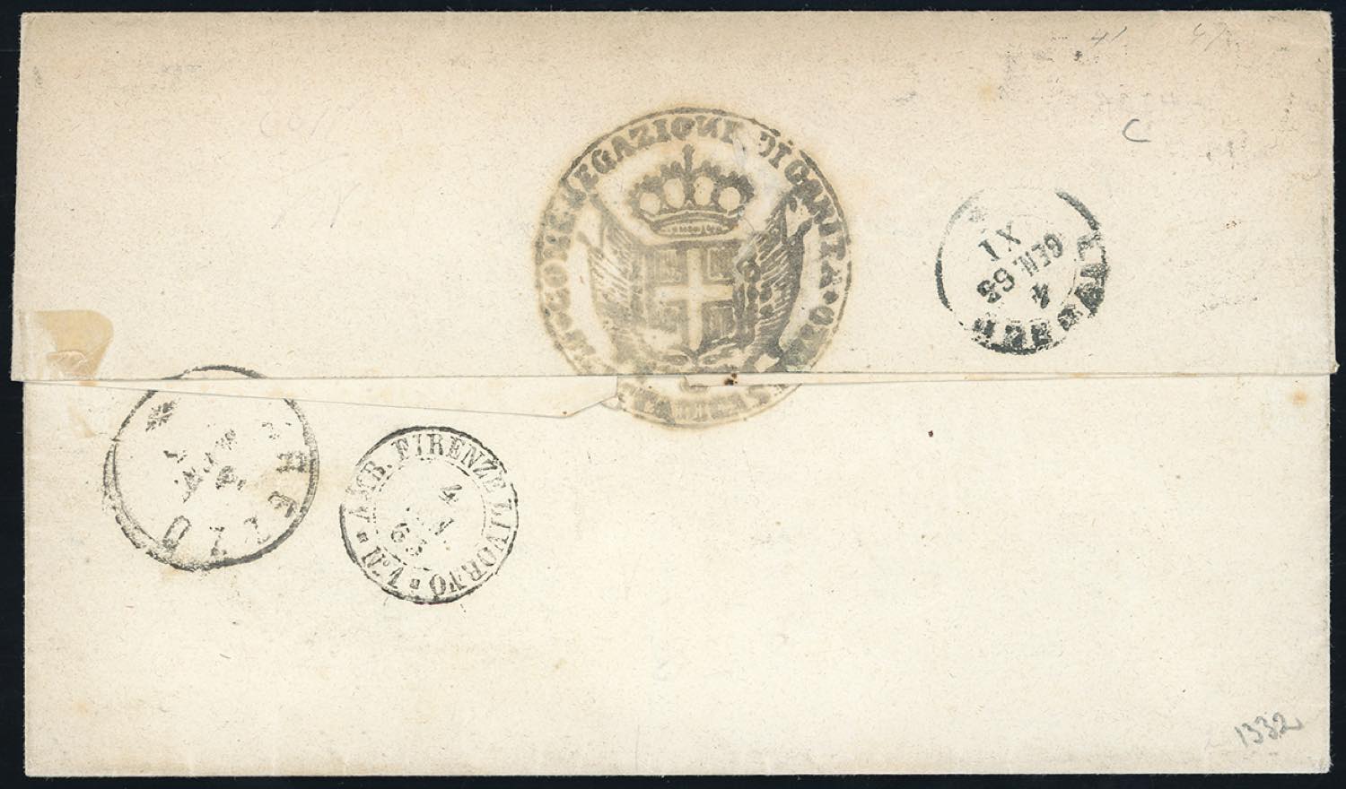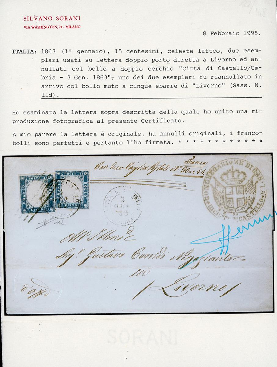 1863 - 15 cent. celeste latteo tipo Sardegna (11d), due esemplari, perfetti, su busta da Citta di Castello 3/1/1863 a Livorno, dove un francobollo venne riannullato in arrivo con il muto a 5 sbarre. Pregevole tinta e insieme raro. Cert. Sorani.