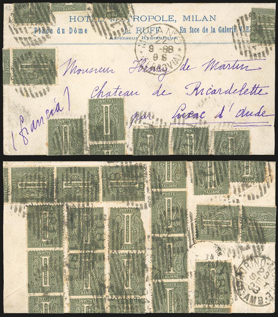 1888 - 1 cent. De La Rue, tiratura di Torino (T14), due singoli, una coppia, quattro strisce di 3, una striscia di 4 e una di 5, difetti, su busta da Milano 22/9/1888 per la Francia. Affrancatura multipla monovalore d'effetto e rara, soprattutto per l'estero.
