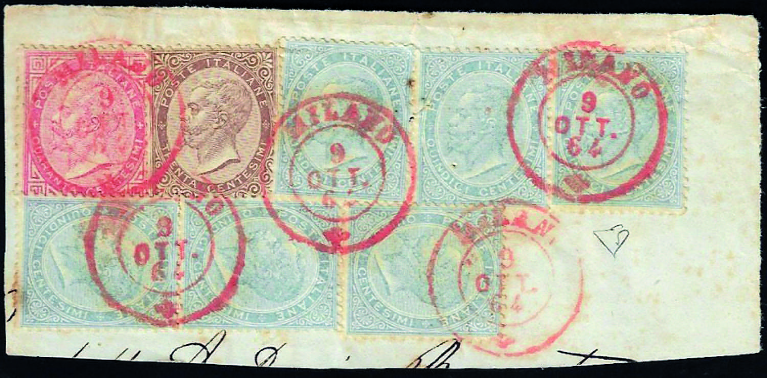 1863 - 15 cent., sei esemplari, 30 cent., 40 cent. De La Rue, tiratura di Londra (L18/L20), ottimo stato, usati su frammento a Milano 9/10/1864, annullo rosso. D'effetto. E.Diena.
