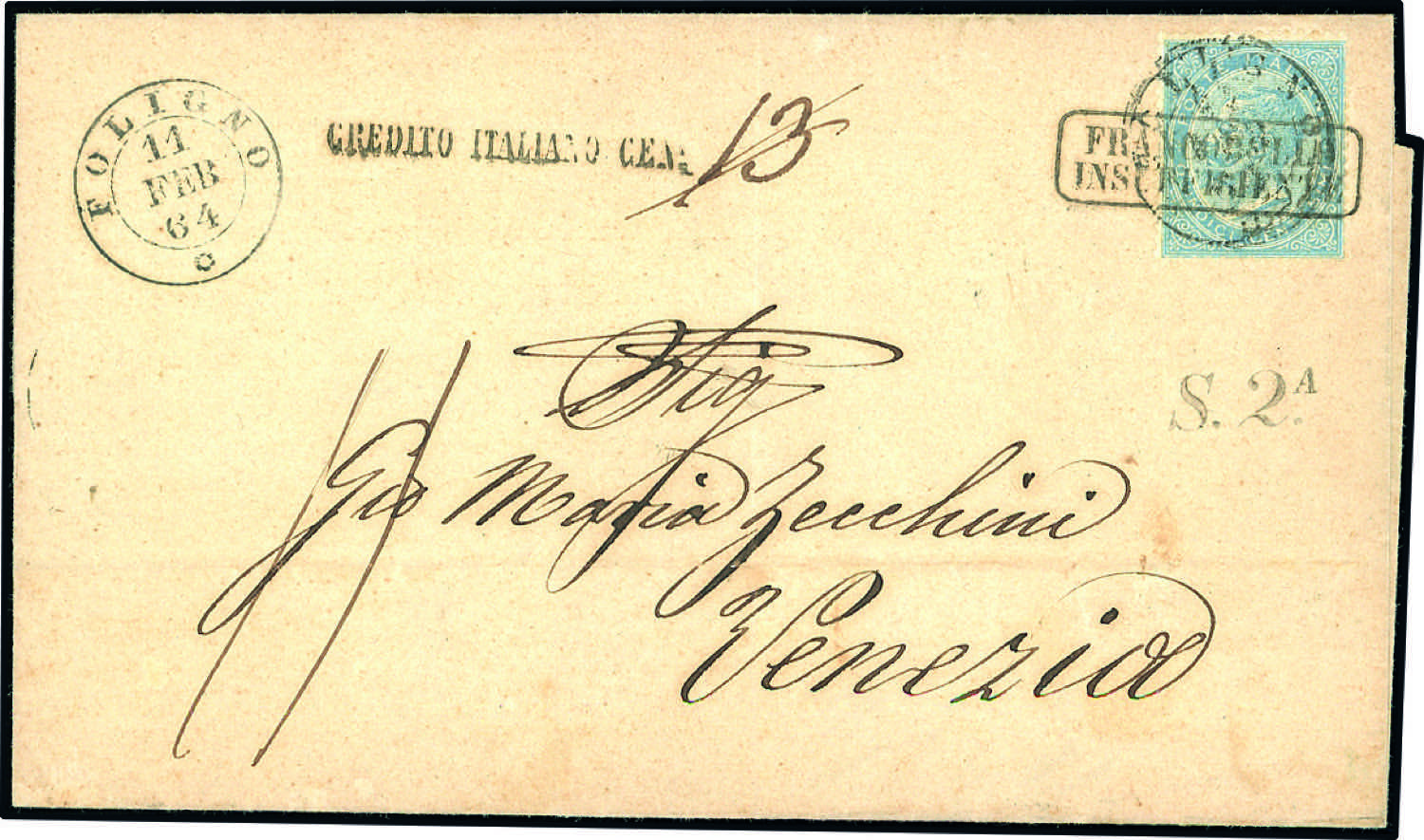 1864 - 15 cent. De La Rue, tiratura di Londra (L18), perfetto, su sovracoperta di lettera da Foligno 11/2/1864 a Venezia. Il francobollo è stato coannullato con il bollo in cartella "Francobollo Insufficiente"; a lato "credito italiano cent.13" e "S2A". Interessante e rara.