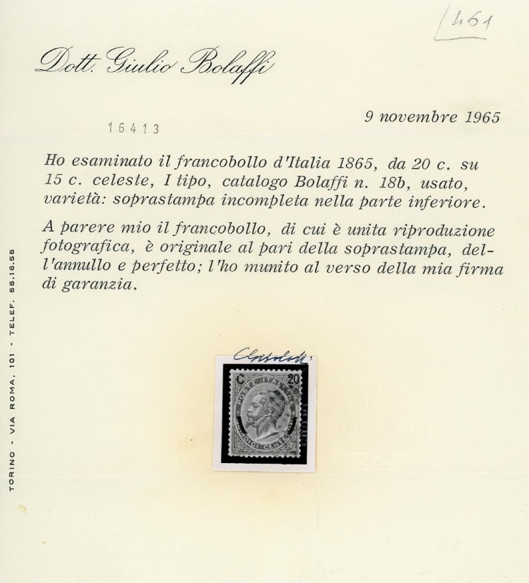 1865 - 20 cent. su 15 cent. Ferro di cavallo, I tipo, soprastampa molto incompleta nella parte inferiore (23f), usato, perfetto. Splendido e raro. Em., A. ed E.Diena, cert. G.Bolaffi.