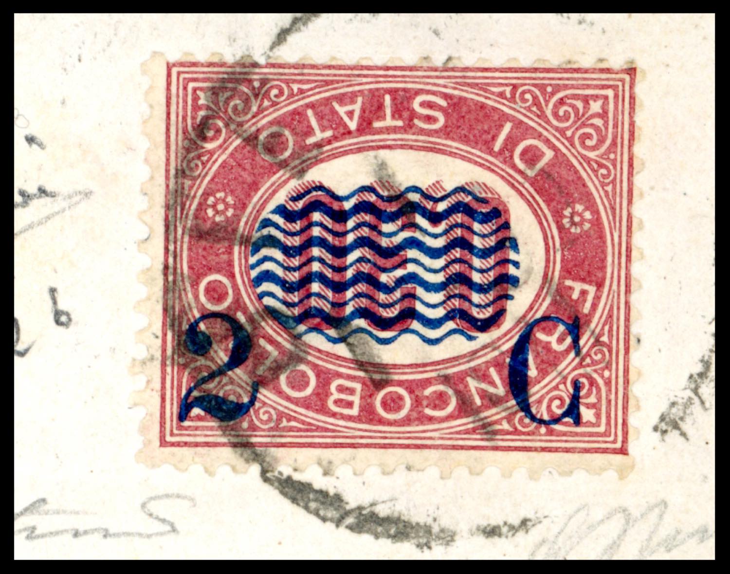 1879 - 2 cent. su 0,30 lire Servizio soprastampati, SOPRASTAMPA CAPOVOLTA (32b), perfetto, isolato su sovracoperta di lettera da Biella 31/12/1879 a Vercelli. Molto rara. G.Oliva, cert. Sorani e Ferrario.