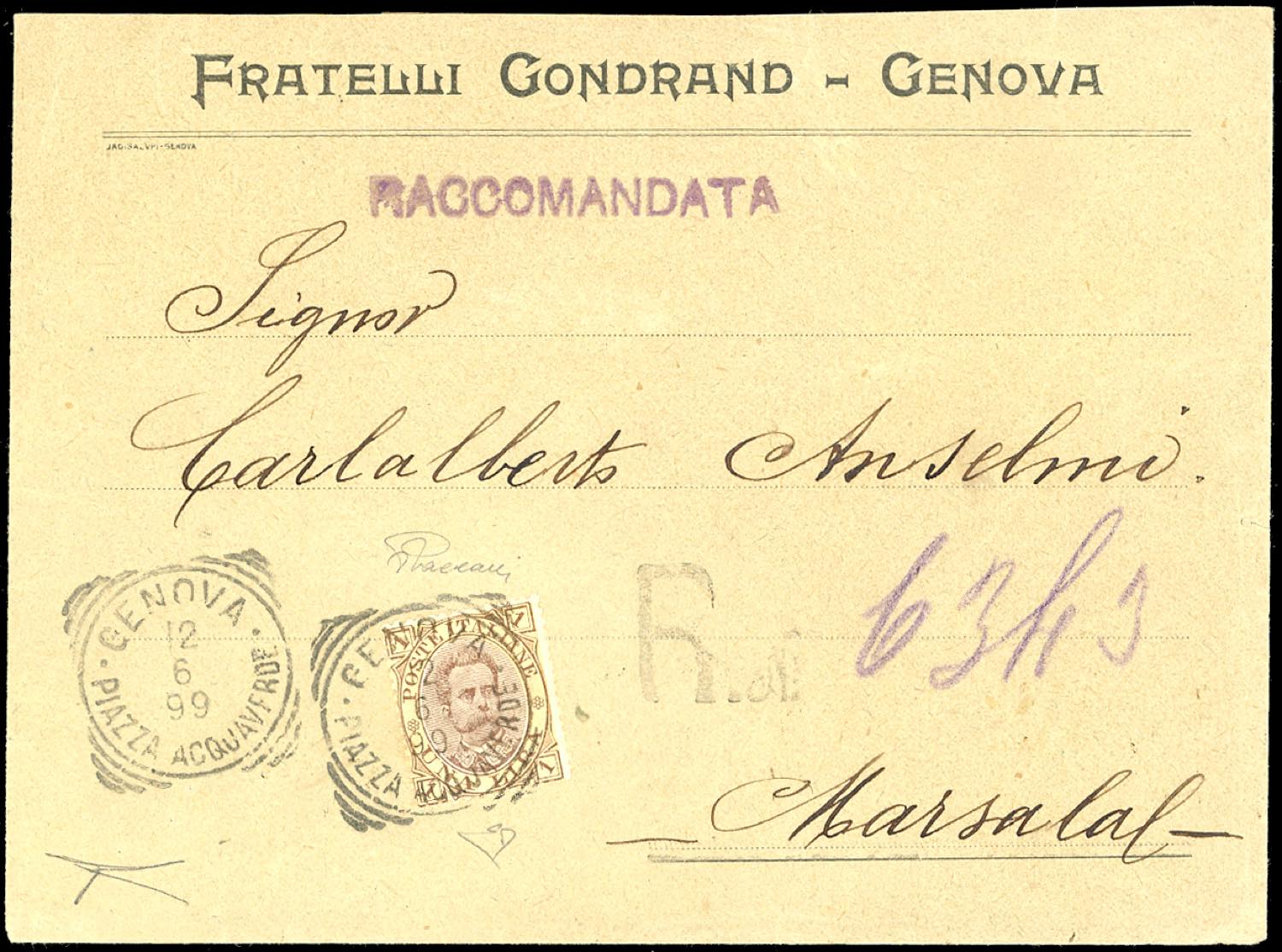 1899 - 1 lira Umberto I (48), perfetto, isolato su busta raccomandata da Genova 12/6/1899 a Marsala. Pregevole uso isolato, di ottima ... Leggi tutto