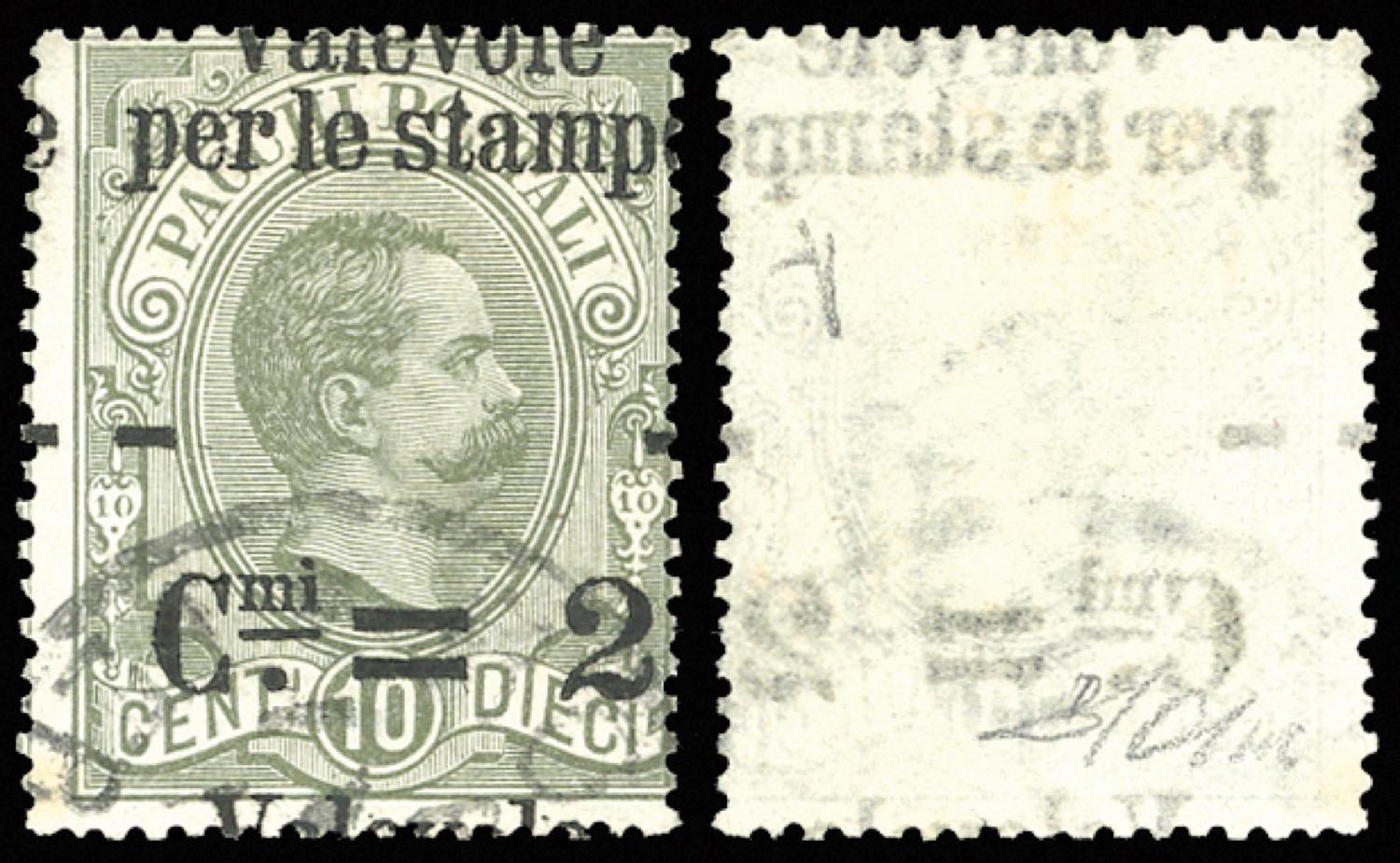 1890 - 2 cent. su 10 cent. Valevole per le stampe (50), soprastampa fortemente spostata in alto ("Valevole" a cavallo) e a destra, con ... Leggi tutto