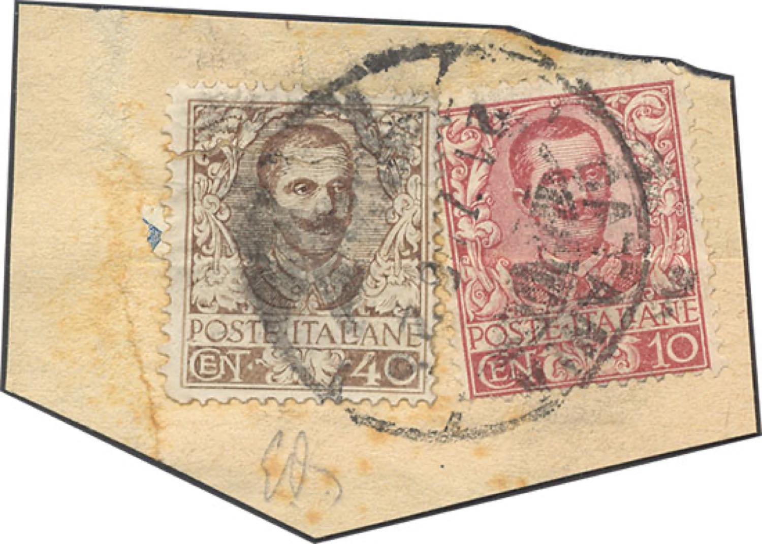 1906 - 40 cent. Floreale, falso per posta di Catania, difettoso, come sempre, con valore complementare perfetto (F74,71), usati su frammento a Catania. Quotazione di catalogo per difettoso. Molto raro! Emilio Diena.