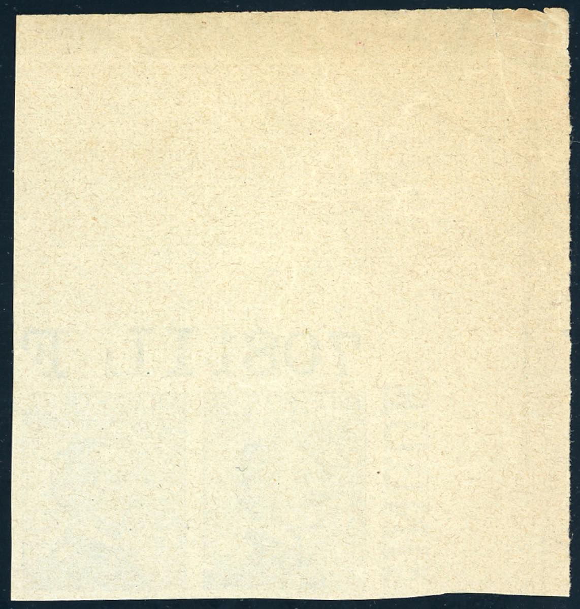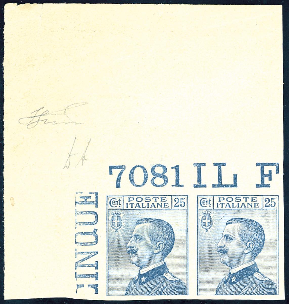 1908 - 25 cent. azzurro Michetti (83), prova di macchina non dentellata, senza filigrana, su carta grigia, coppia orizzontale angolo di foglio superiore sinistro con numero di tavola 7081, senza gomma come sempre, perfetta. Insieme splendido e probabilmente unico. A.Diena, Ferrario.