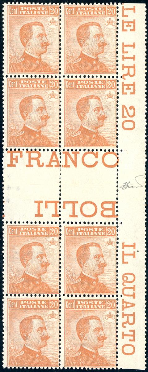 1917 - 20 cent. arancio Michetti, con filigrana (109), blocco di otto margine di foglio con due coppie con interspazio di gruppo verticale ... Leggi tutto