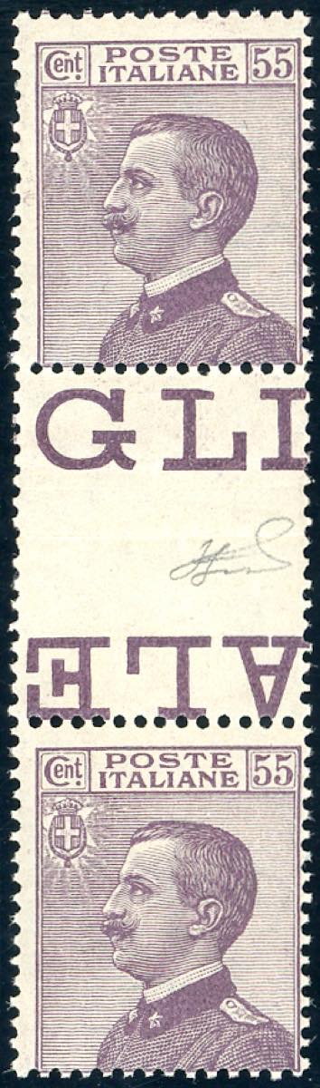 1918 - 55 cent. violetto bruno Michetti (110), coppia verticale con interspazio di gruppo al centro, nuova, gomma originale integra, perfetta. Bella e non catalogata. Ferrario.