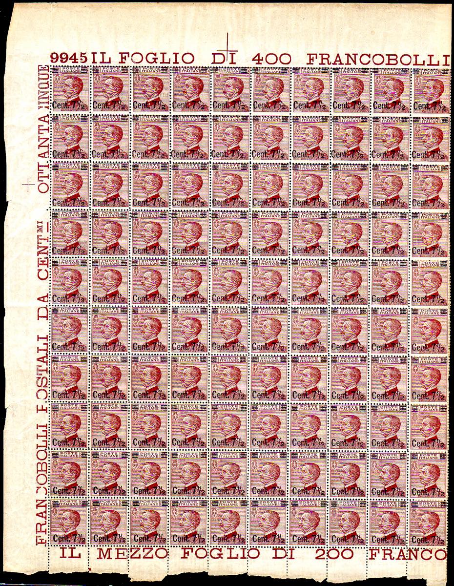 1924 - 7 1/2 cent. su 85 cent., I tipo, decalco del francobollo (135zb), foglio completo di 100 esemplari comprendente 47 esemplari con ... Leggi tutto