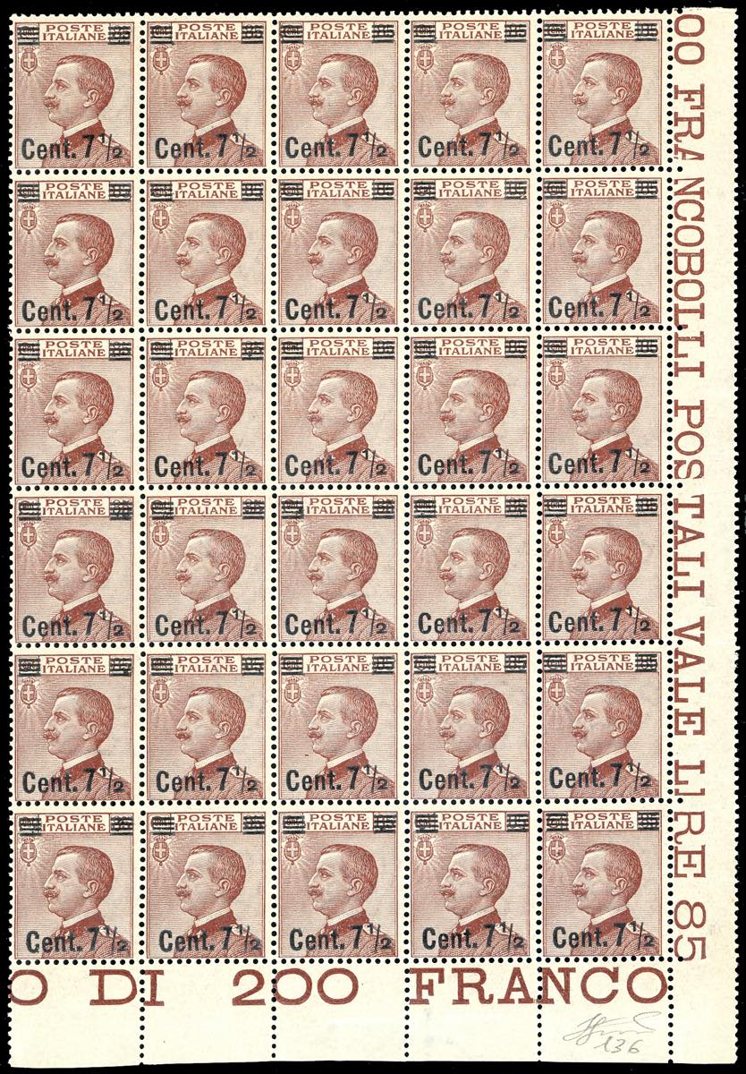 1927 - 7 1/2 su 85 cent. Michetti soprastampa del II tipo (136), eccezionale blocco di 30 esemplari, nuovo, gomma originale integra, perfetto. Splendido, buona/ottima centratura. Ferrario (cat.Sassone € 2.625/€ 10.500).