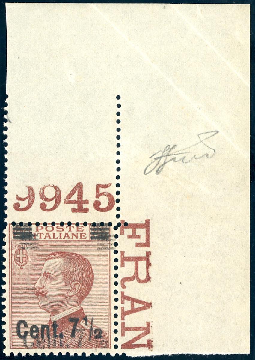 1927 - 7 1/2 su 85 cent. Michetti, doppia soprastampa del II tipo (136b nota), angolo di foglio superiore destro con numero di tavola 9945, ... Leggi tutto