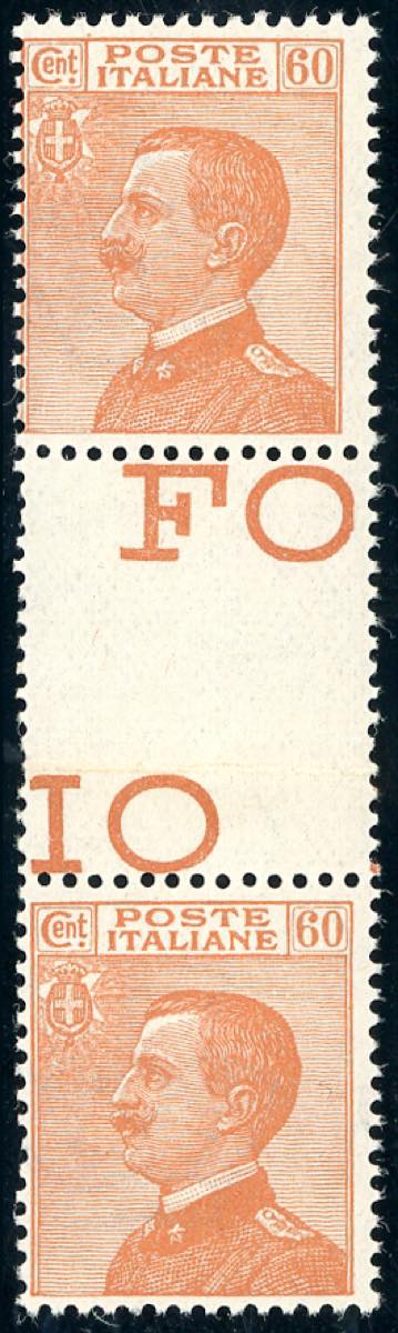 1926 - 60 cent. giallo bruno Michetti, nitido decalco completo (205f), coppia con interspazio di gruppo verticale, perfetti, gomma originale integra. Bello e raro!