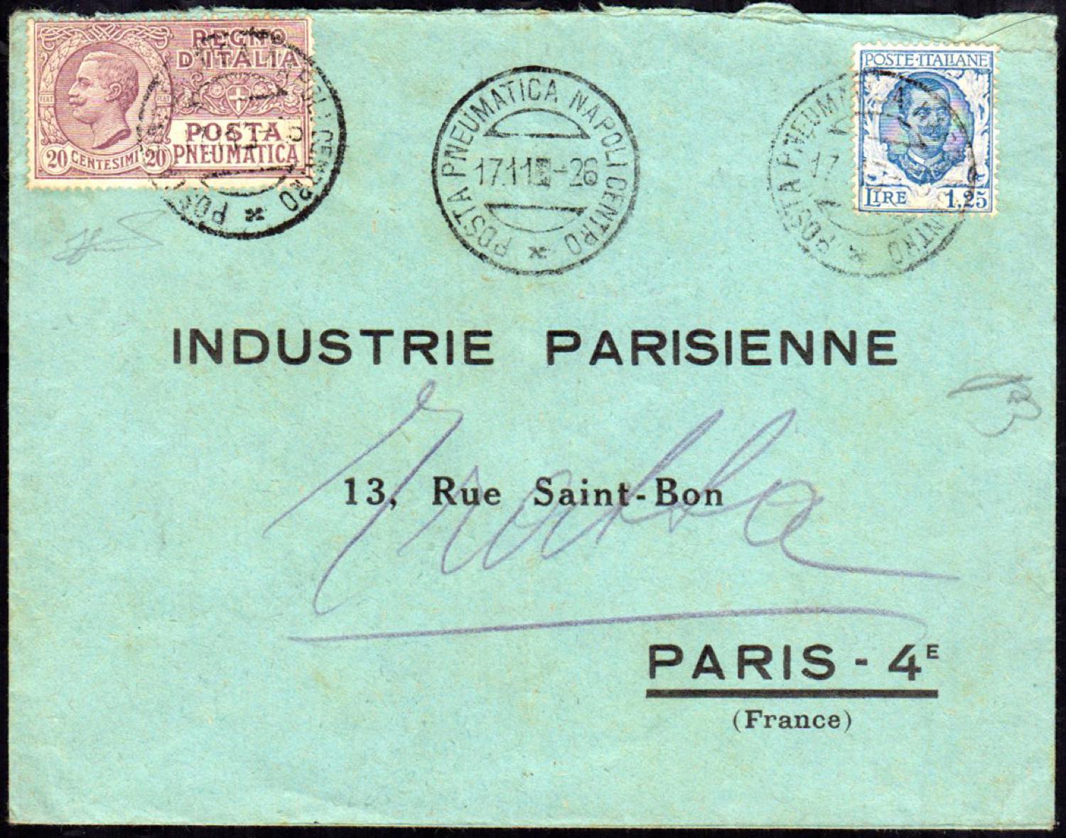 1926 - 20 cent., 1,25 lire Floreale (8,202), perfetti, su busta da Napoli, annullo della posta pneumatica, 17/11/1926 a Parigi. Ferrario.